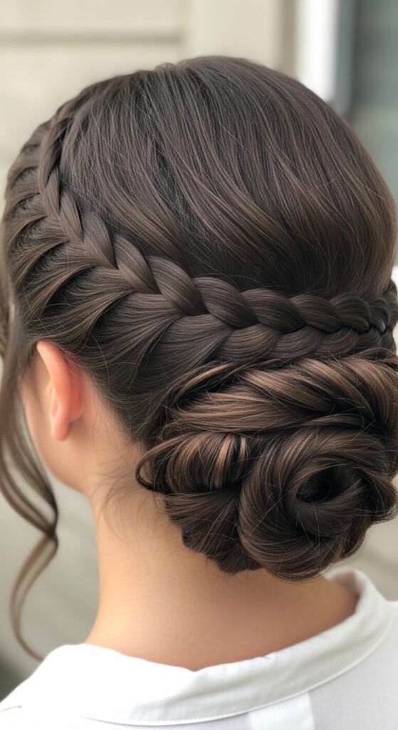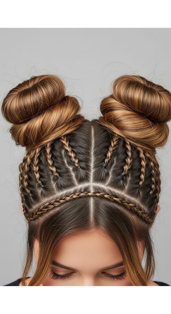 The braids become part of the bun’s structure, making it look more dynamic and detailed than just twisted hair. It’s playful, cute, and perfect for a festival or fun day out.