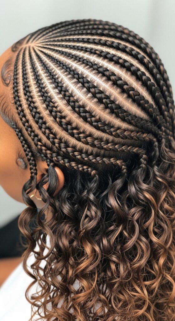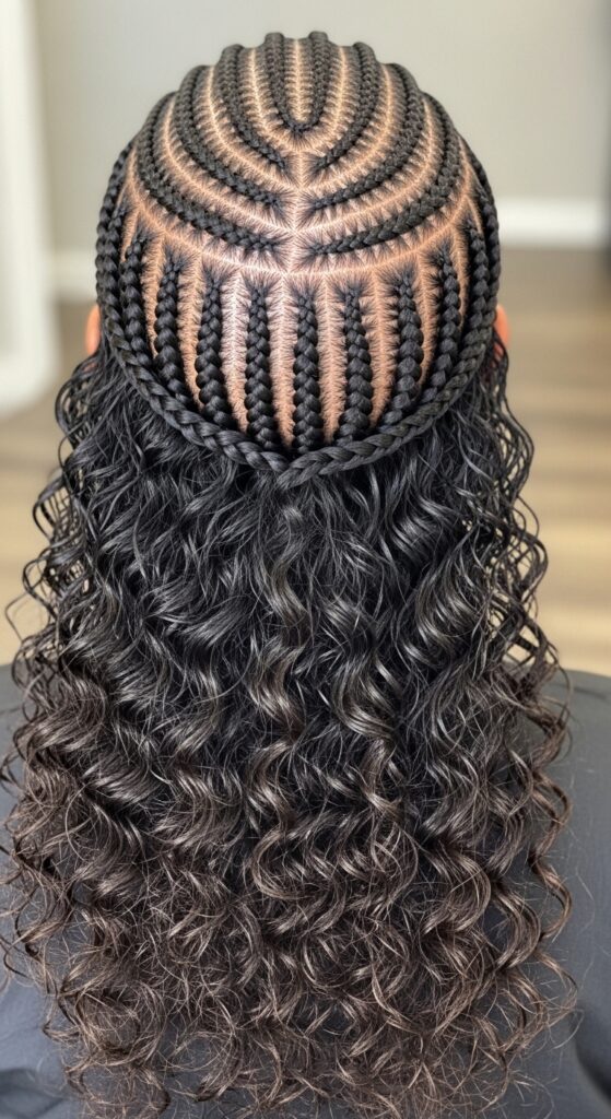 This celebrates multiple textures in one style. The top section of your hair is styled in defined, coiled Fulani-inspired braids or cornrows, creating a regal crown.