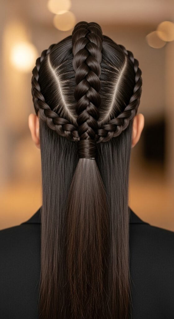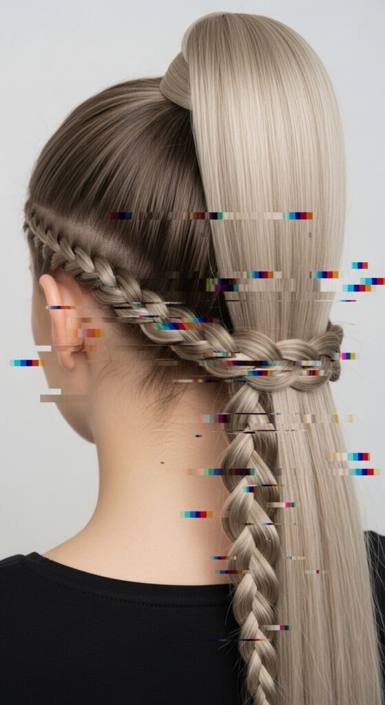 Maybe a braid zig-zags out from the crown before joining the tail. Or small braids are tucked under a section of slicked-back hair, only visible from certain angles. It’s playful, modern, and totally eye-catching.