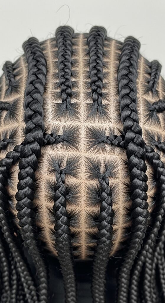 This mix creates a dynamic, eye-catching pattern that looks complex and highly skilled. It shows the full range of the braiding art form.