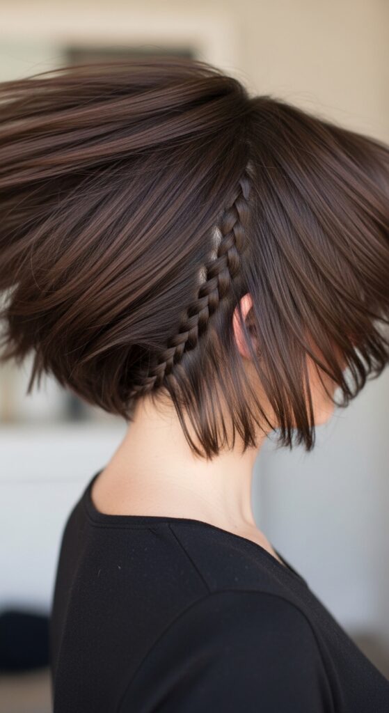 The secret is what you don’t see immediately. On an inverted or angled bob, place the interlaced braids underneath the top layer of hair.