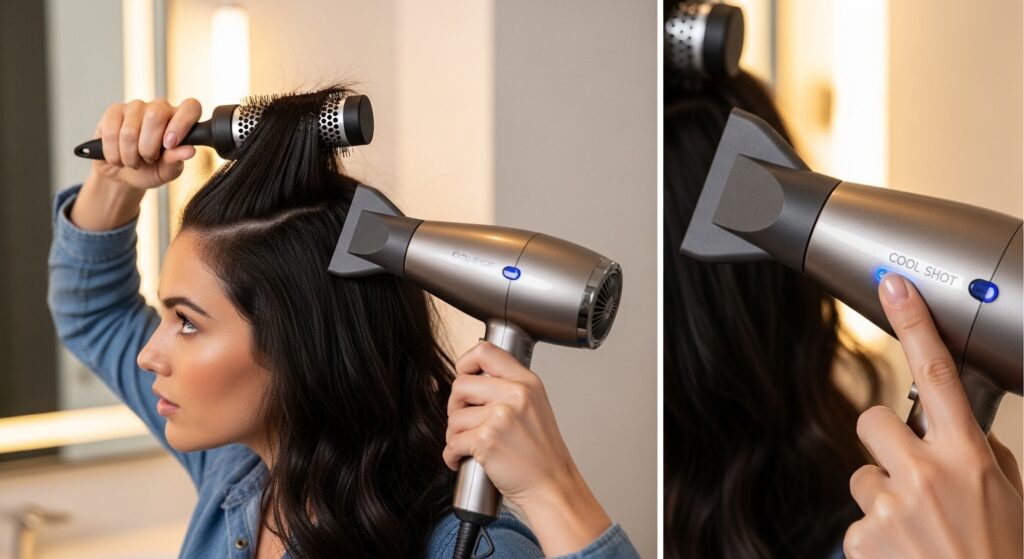 You don’t need a professional blowout every week. You just need to mimic the technique. The most important tool on your dryer is the cold shot button. This one step locks in shape and shine.
