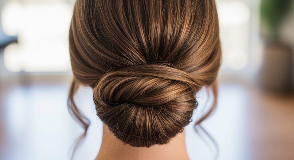 - Twist the ponytail tightly and wrap it around the base, pinning it securely from underneath.