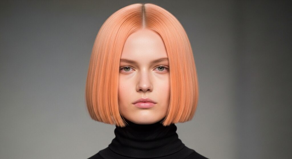 Want to take your peach hair in a more modern and edgy direction? Sharp bobs, blunt cuts, and even pixie cuts look incredible with this color. The contrast between a severe, geometric cut and the softness of the peach hue creates a fascinating and fashion-forward tension. Accessorize with gold hair clips or a sleek black headband to elevate the look.