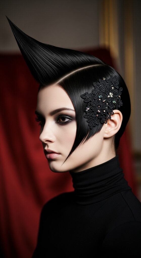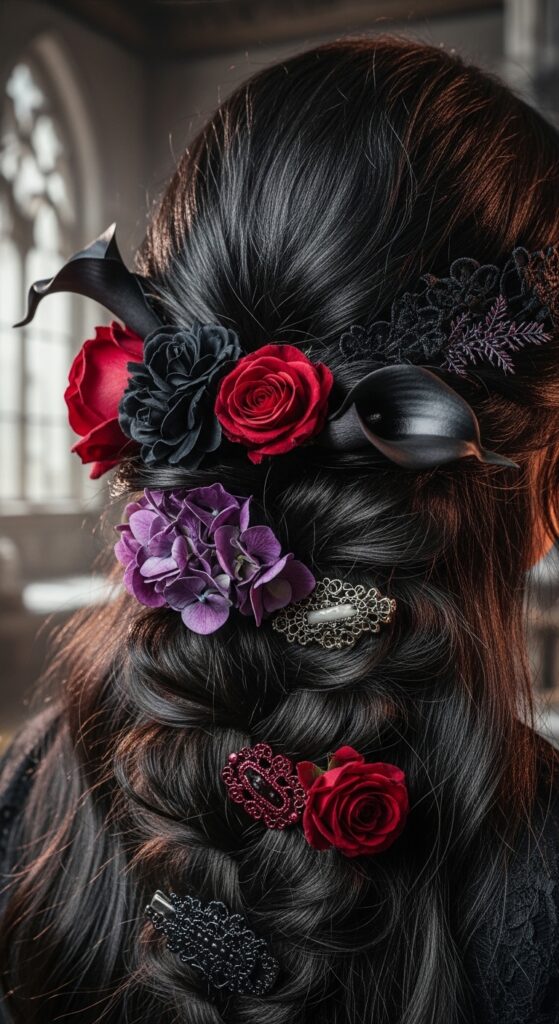 Romantic goth hairstyles blend softness with structure. Think intricate braids with wispy tendrils. Use small lace clips to secure the ends of braids or to pin small flowers or lace accessories into your hair.