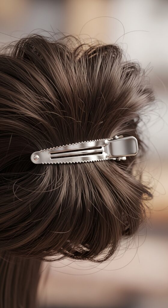Gather it at the back, but instead of a hair tie, criss-cross two lace clips in an “X” formation to secure it. This method gives a chic, seamless look with way more hold and volume than a single clip or tie.