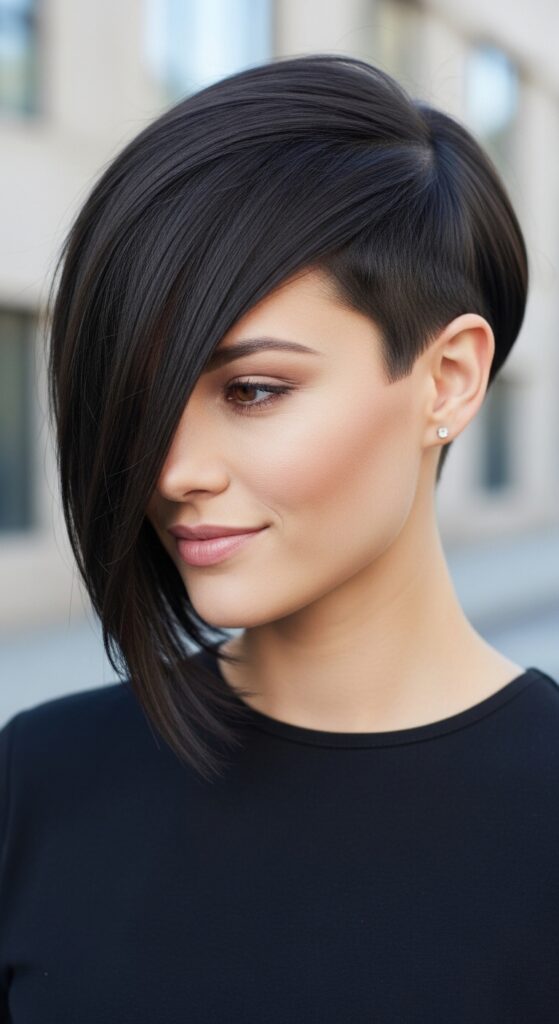 An asymmetrical lob needs its shape to be visible. To emphasize the angle, create a deep side part. On the heavier, longer side, take a section from the underside near the back.