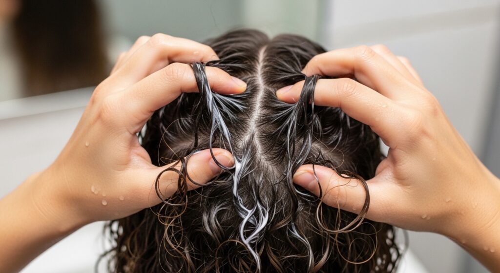 Apply a dime-sized amount of curl cream or leave-in conditioner to your palms. Gently scrunch it into your ends and mid-lengths. Avoid the roots directly.