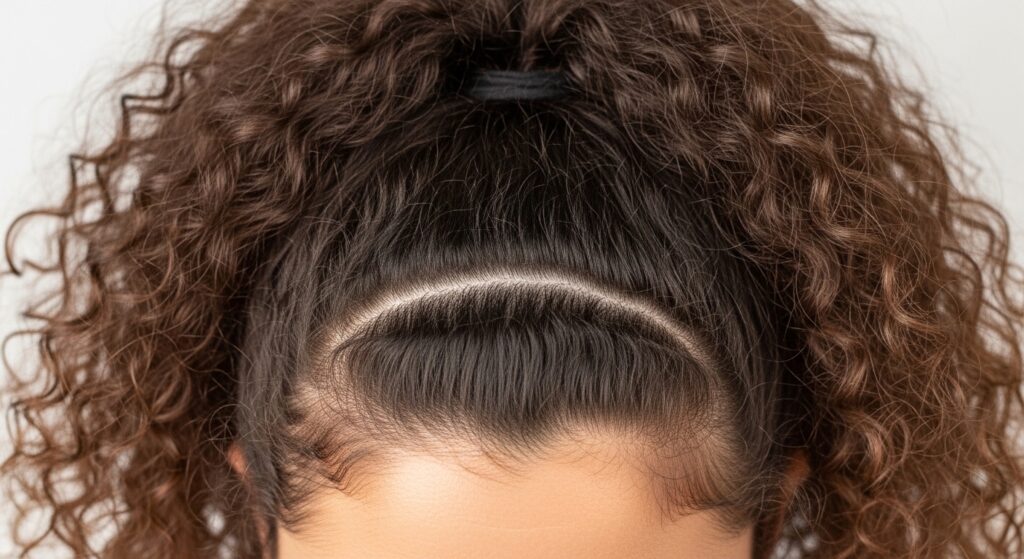 This method works across curl types, with slight tweaks. For looser waves or 2C/3A hair, make the top section smaller and use a texturizing spray first for grip.