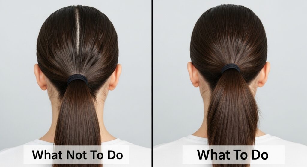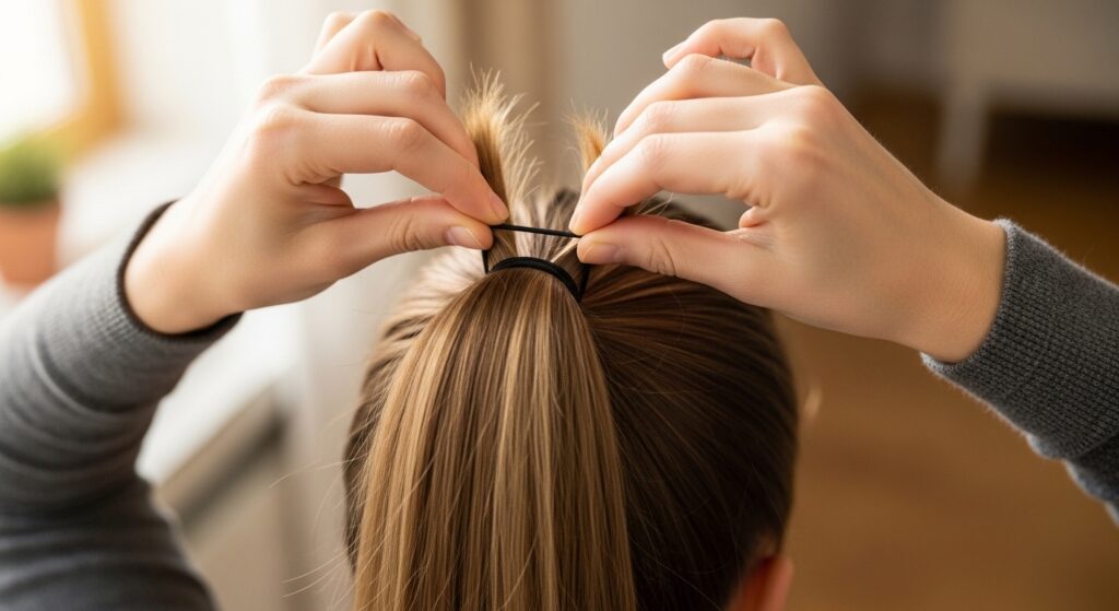 Here’s the key: do not pull it tight. Leave a generous amount of space between the base of the ponytail and your scalp. You should be able to fit a few fingers underneath easily.