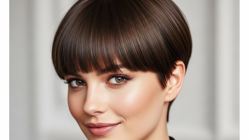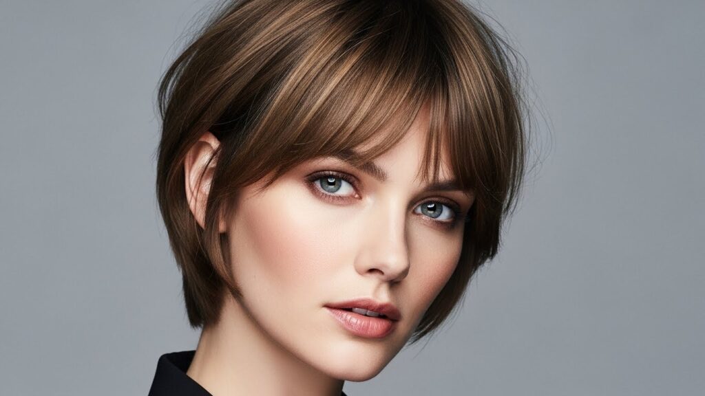 Ideal Pixie & Bangs Combo: Bangs are absolutely essential here! They are the perfect tool to camouflage a broad forehead. Opt for full, blunt bangs or heavy, side-swept bangs that cover a significant portion of the forehead. For the pixie itself, styles that have width and volume at the jawline are ideal. A pixie that is longer at the nape of the neck or one with pieces that frame the chin can help add visual weight to the lower part of your face.