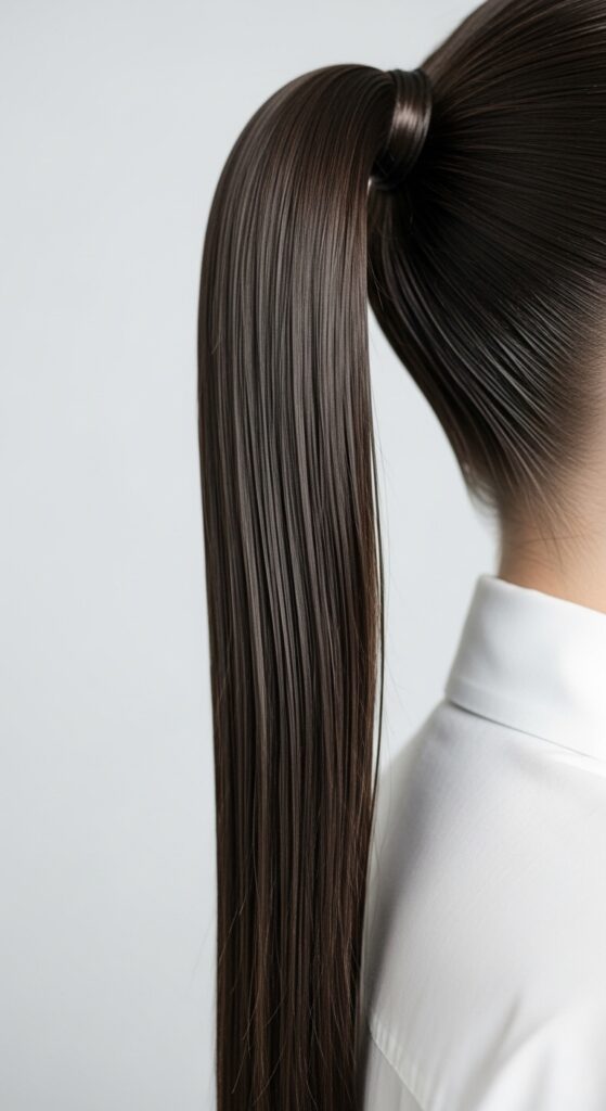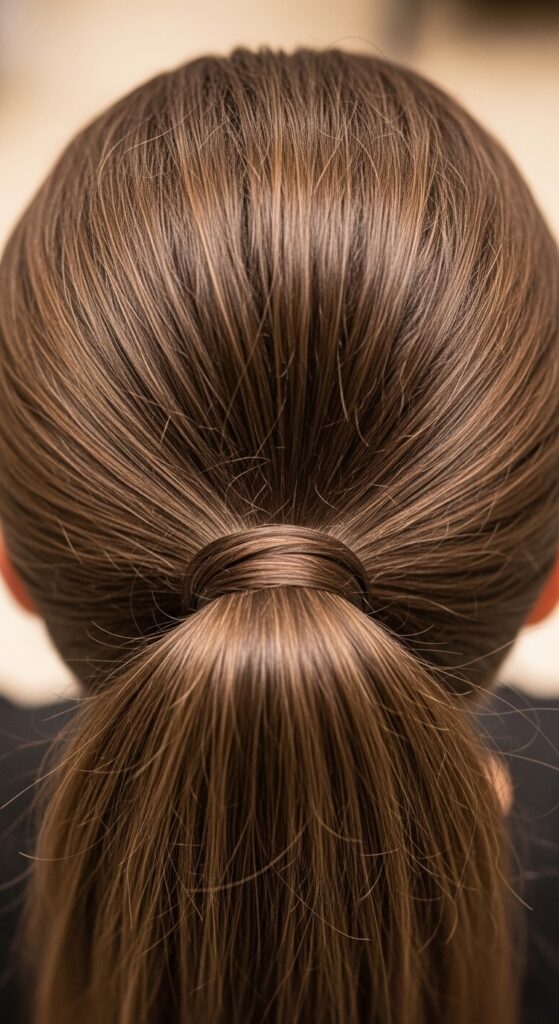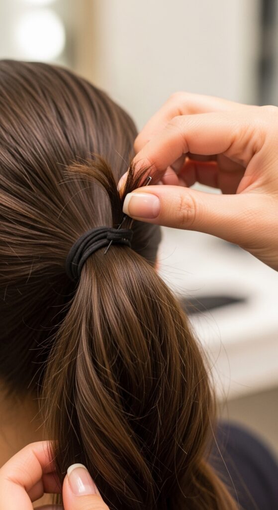 Precision placement is useless if it slips. After securing with an elastic, take a small section of hair from beneath the pony. Wrap it tightly around the base to cover the band.