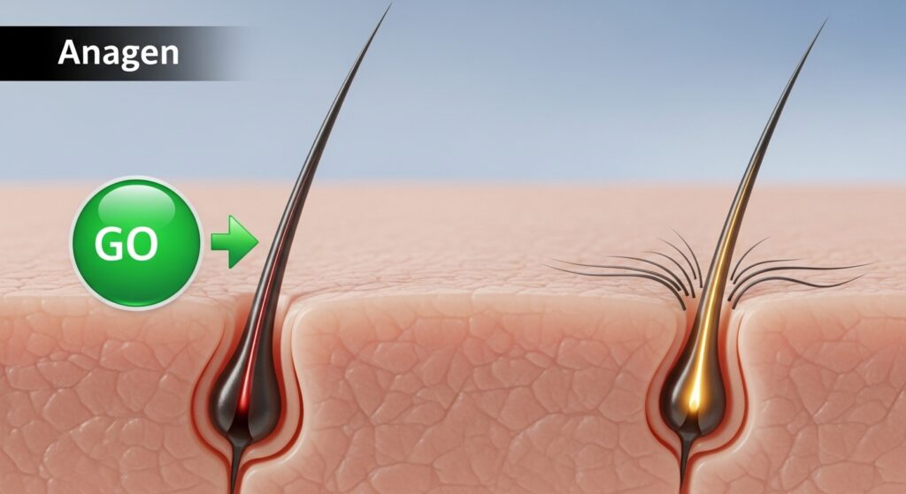 2. Catagen (Transition Phase): A brief, two-week transitional period where growth stops and the outer sheath of the root shrinks and attaches to the hair root.