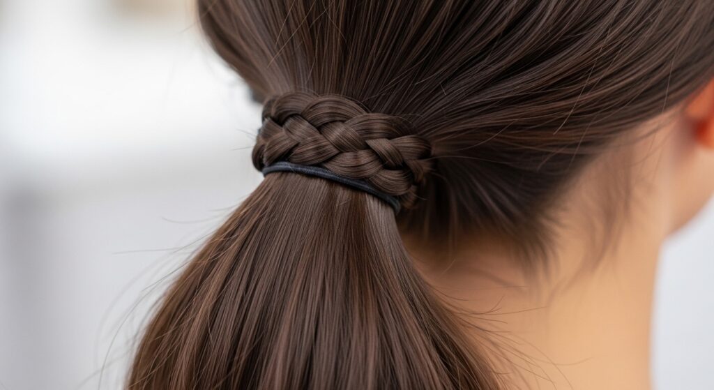 Braid this small section tightly and secure the end with a tiny clear elastic. Then, gather all your hair, including this braid, into your main ponytail over it. The braid acts as a rock-solid anchor.