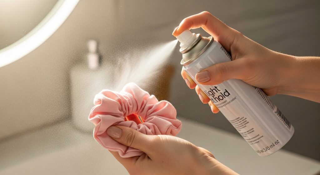 Here’s a weird trick that works: give your hair tie some grip too. Before you put your elastic on, give it a quick, light spritz of hairspray. Let it get just slightly tacky for a second.