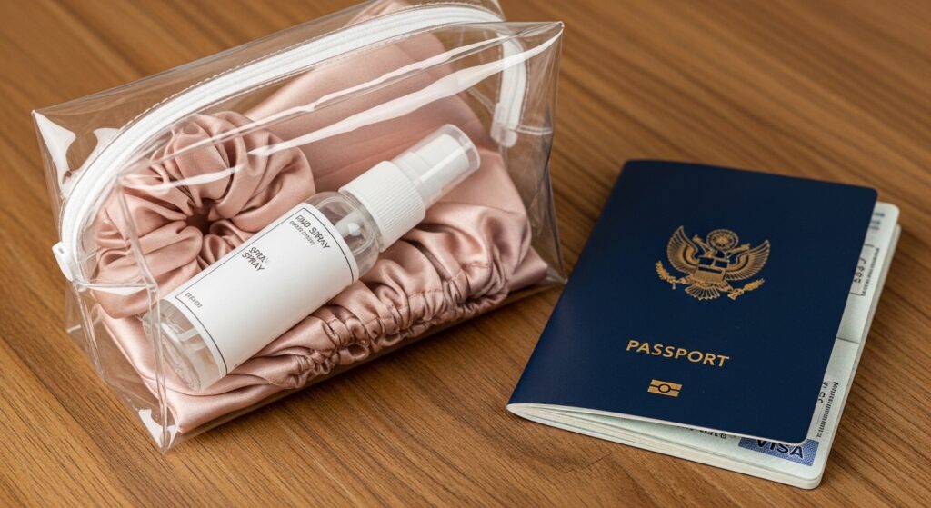 Never get caught with flat hair on vacation! I decant my favorite spray into a TSA-friendly travel-size bottle. My kit also includes a mini satin bonnet, two satin scrunchies, and a travel diffuser.