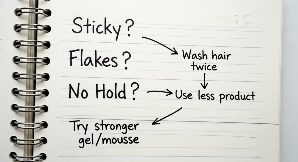 Problem: Hair feels sticky. Fix: You’re using too much. Next time, spray from farther away. Problem: White flakes. Fix: The spray isn’t mixing with your initial product. Apply to damper hair.