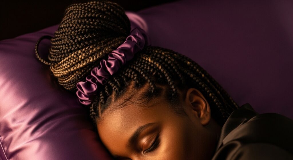 I like to loosely gather my braids on top of my head under a large bonnet. This prevents friction, reduces frizz, and lets you wake up with your style perfectly intact and still moisturized.