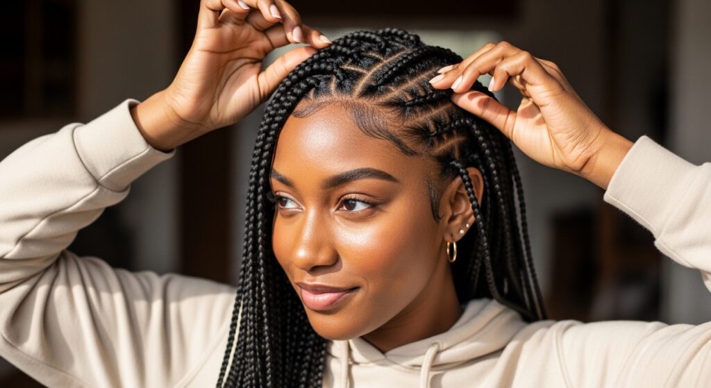 Stand up, flip back, and give your head a gentle side-to-side shake. This redistributes the braids, adds volume, and gets rid of that “stiff” look. It makes your style look lived-in and effortless.