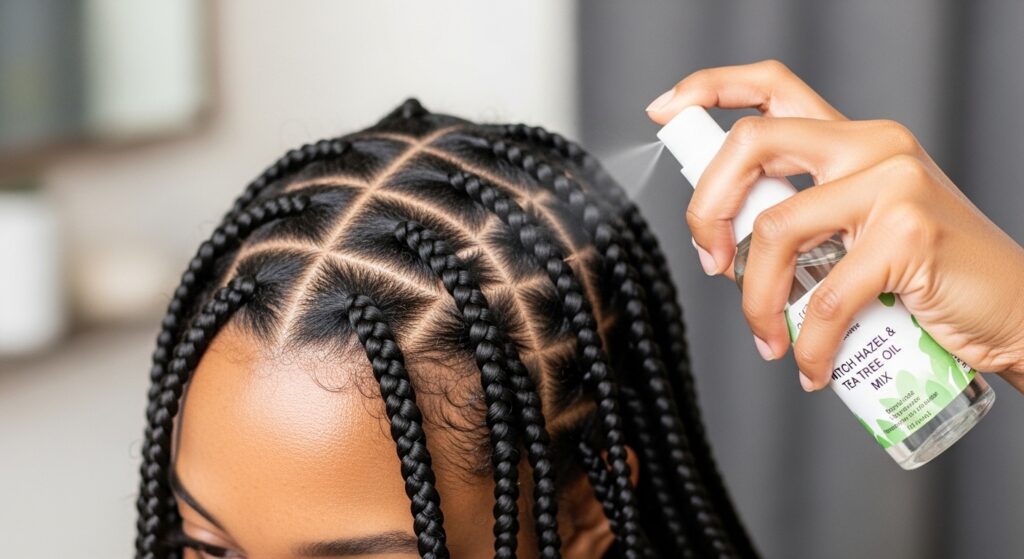 Fill a small spray bottle with 3 parts witch hazel or rose water to 1 part water. Add a few drops of tea tree oil for its soothing properties. Part your braids and lightly mist your scalp.