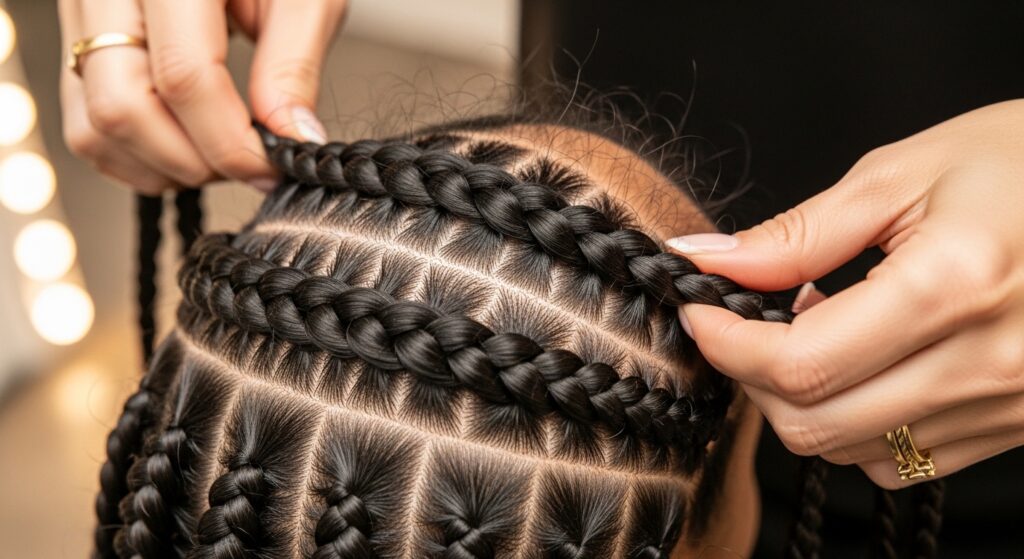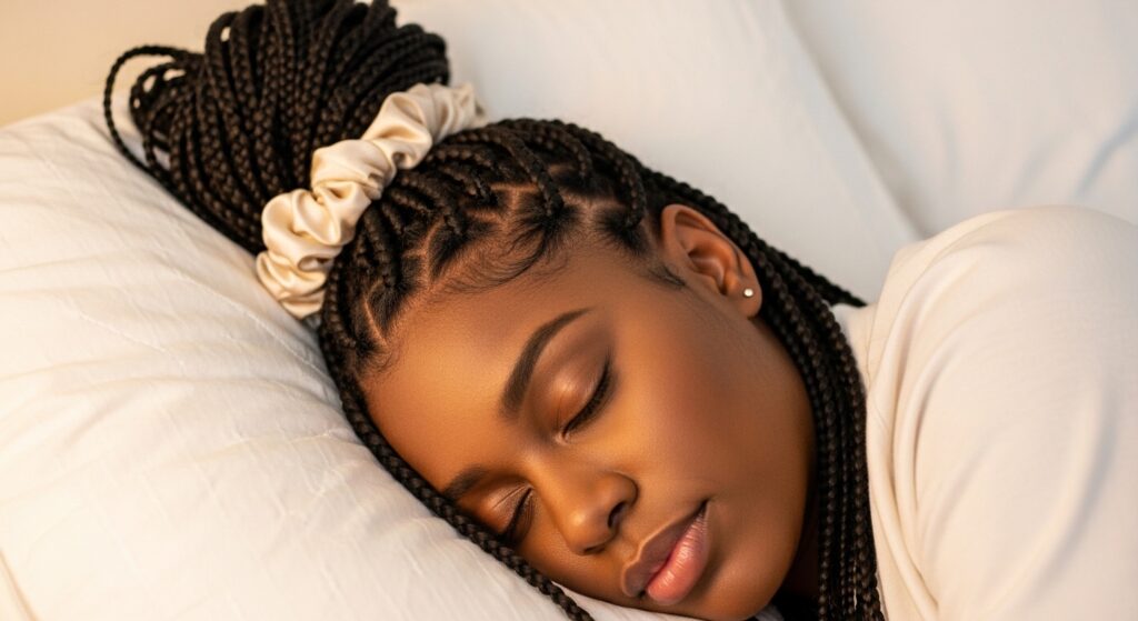 Flat braids at the root? Let’s bring back the volume. Before bed, gather all your braids at the very top of your head like a pineapple. Use a silk scrunchie, not a tight band.