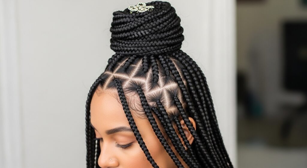 Pull your braids up, but leave out two in the front to frame your face. This style has that effortless quiet luxury bob energy but with braids. It’s polished and perfect for any meeting or dinner.