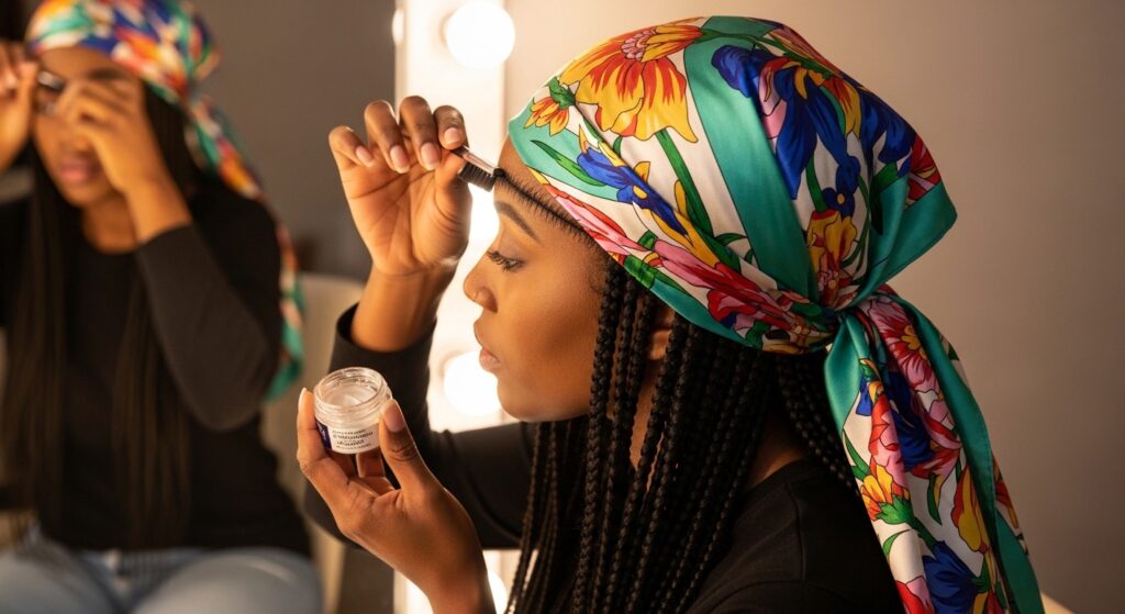 For the braids themselves, take your favorite silk or satin scarf. Apply a tiny bit of edge control or gel to your palms, lightly smooth over the frizzy parts, then tie the scarf down tightly for 10-15 minutes.