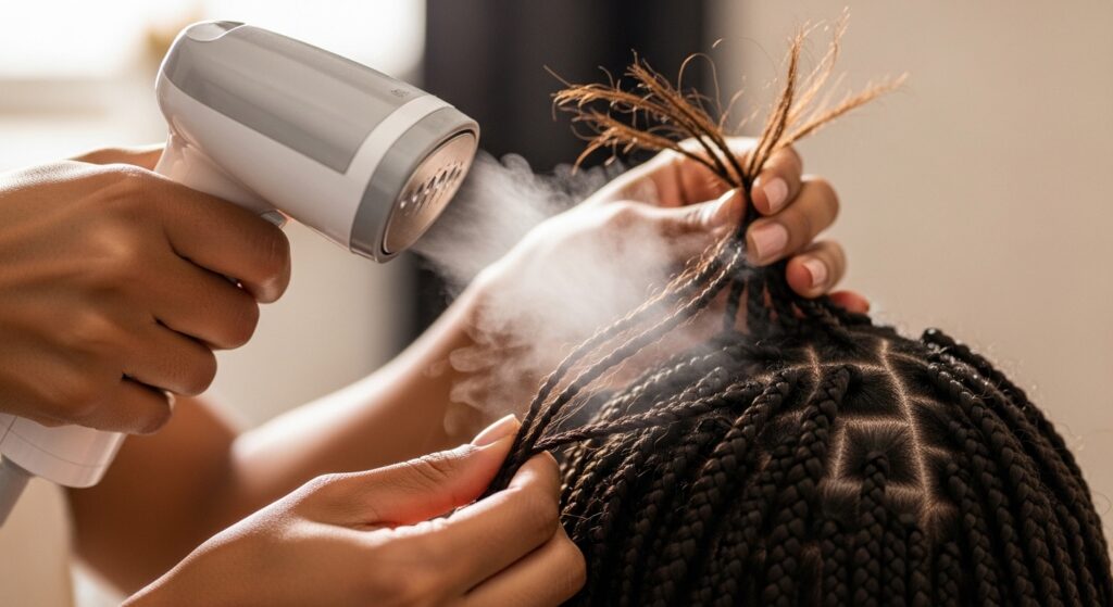 You don’t need a fancy steamer. A handheld garment steamer works perfectly. Just hold it a few inches away and gently pass it over your braids, focusing on the frizzy areas.
