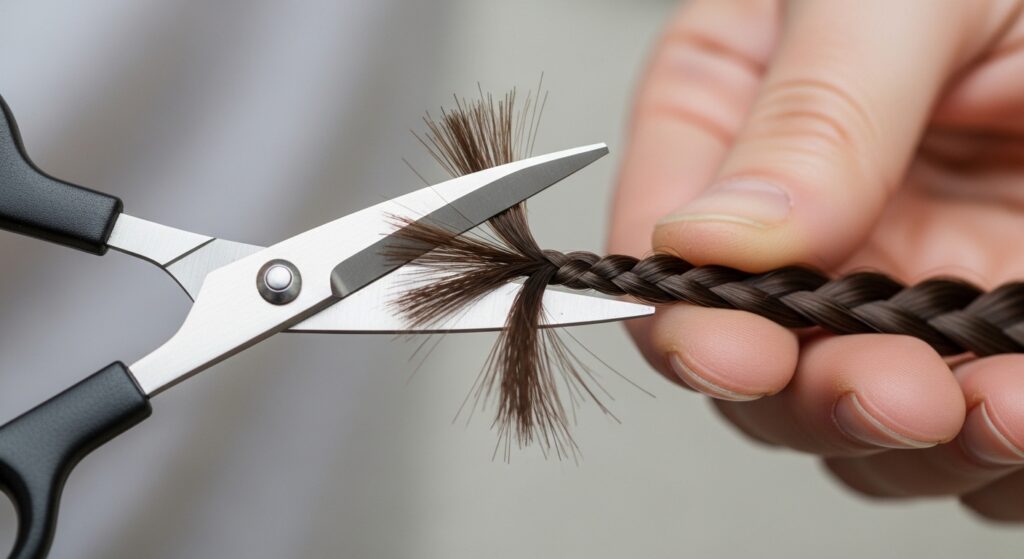 Dip the very end of the braid in, twist slightly, and let it dry. If the ends are thin and wispy, a careful micro-trim can make them look full again. Only trim the very tip!