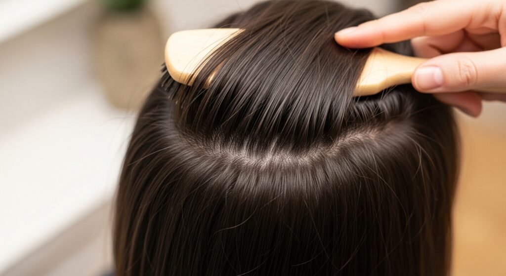 Once all clips are in, the real magic happens. Gently backcomb the root area where the extension attaches to your hair. This helps lift your natural hair to meet the extension hair, erasing any obvious lines.
