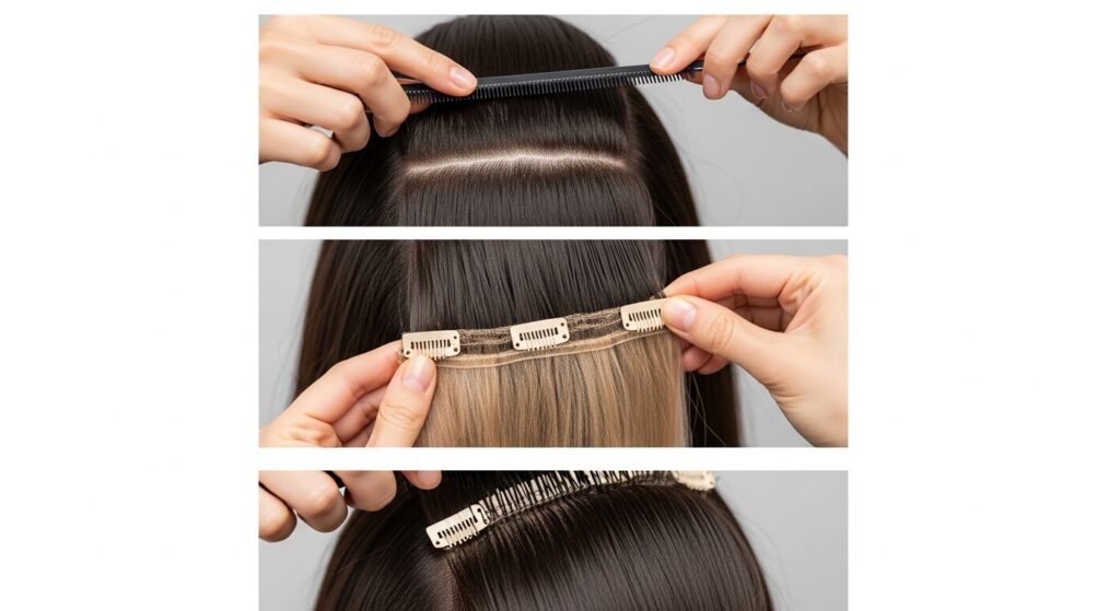 2. Place the First Weft: Take your widest clip-in weft. Open the clips, position it directly on the part line, and snap it closed firmly onto your root hair.