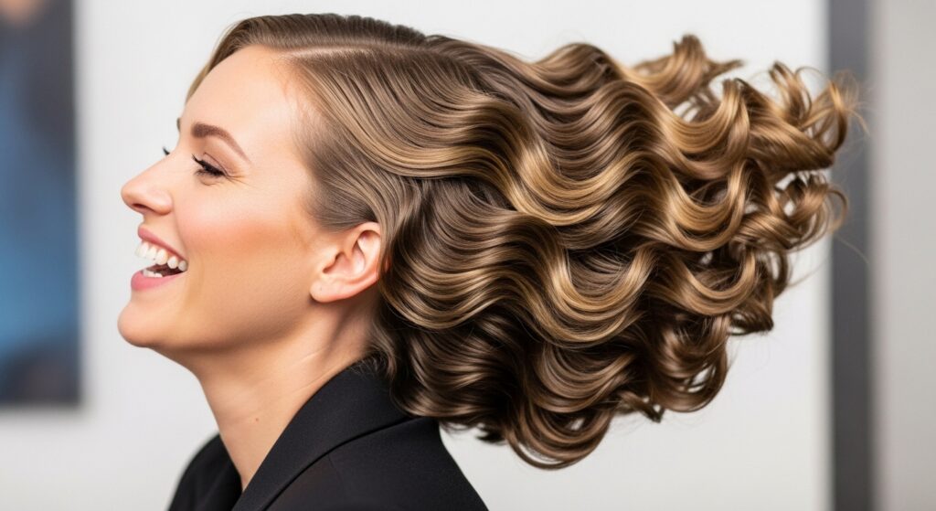 Start with volumizing mousse at the roots. Create large pin curls across your head after curling sections. Let them cool completely. When you brush out, you’ll get incredible, lasting volume and seamless waves that feel expensive—true old money hair vibes.