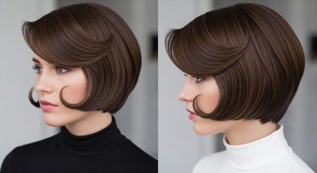 The asymmetrical lob gets a retro twist when you add a strong, outward flip at the ends on the longer side. It’s playful, architectural, and a fresh take on 60s mod styling.