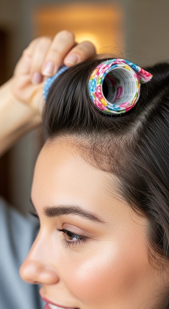 • For extra volume at the crown, roll two small sections at the top of your head vertically.