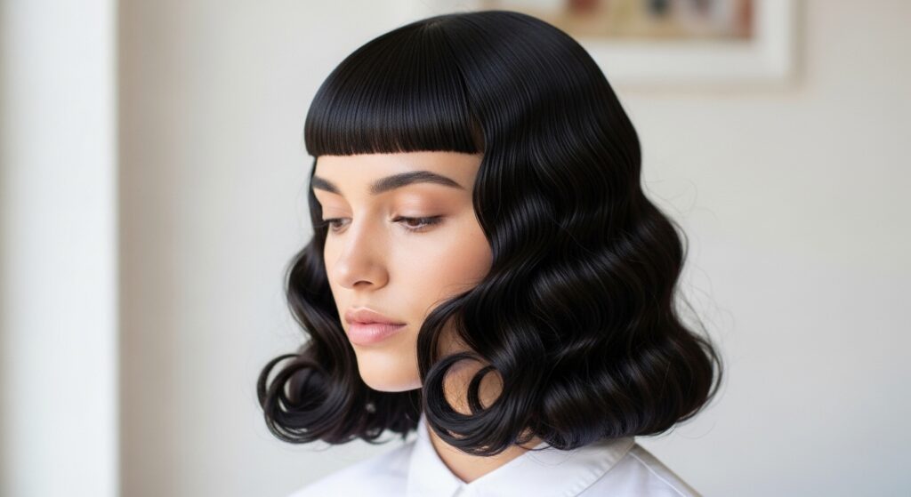 You can leave the back sections straighter or wrap them with larger curlers for a subtle wave. This creates beautiful contrast and makes the bold, blunt lines of the haircut even more striking.