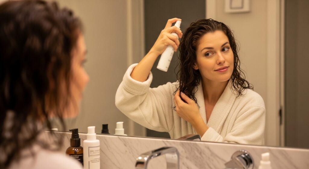Then, I apply a generous amount of leave-in conditioner from mid-lengths to ends. This prevents frizz and makes the curls clump together beautifully. For extra hold, I follow with a golf-ball-sized amount of mousse, raking it through the same sections.