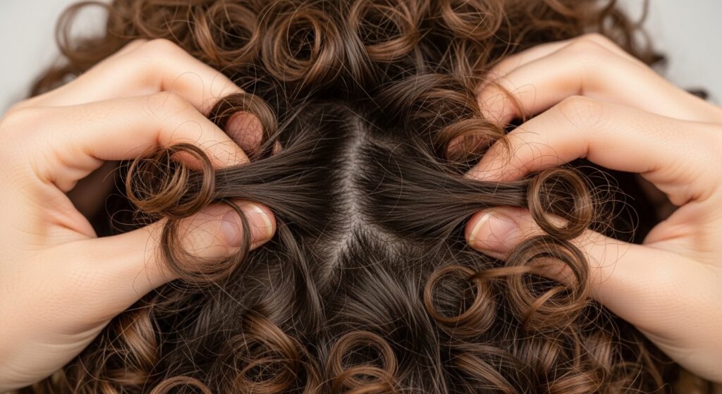 Take a small amount of hair oil or serum on your palms, rub them together, and gently scrunch your hair upwards. This breaks the “cast” from the mousse without causing frizz, leaving soft, bouncy ringlets.