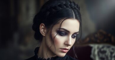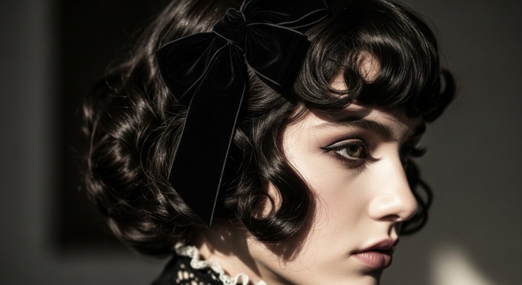 Accessorize with velvet ribbons, lace, or delicate silver chains woven through the curls. Keep the finish matte with a light-hold hairspray to enhance the ethereal, romantic goth hairstyles feel.