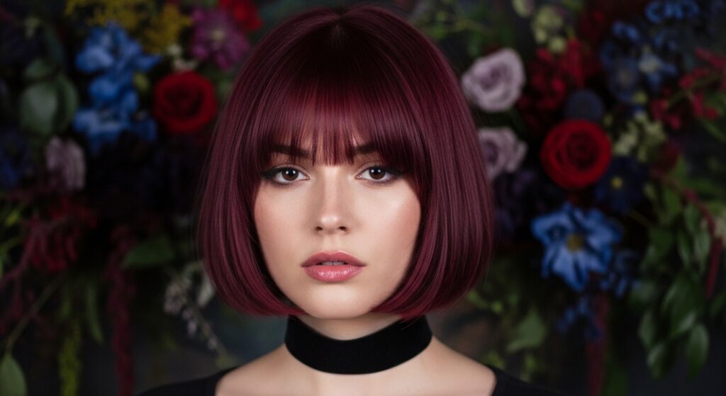 The hime cut, with its straight-across bangs and sharp face-framing pieces, inspires this look. The bangs are fuller and blunter, contrasting with the bob’s length.