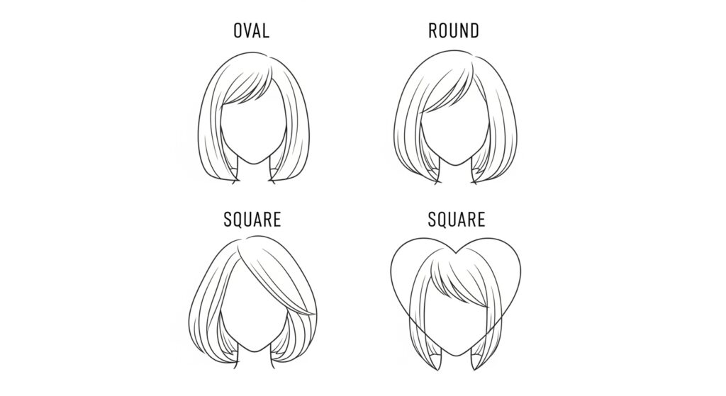 Square faces soften with textured ends and side-swept bangs. Heart-shaped faces are perfect for chin-length bobs with wispy bangs to balance the forehead.