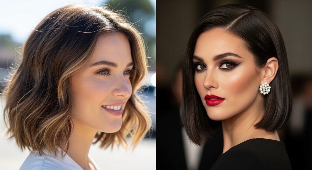 A bold lip color instantly elevates the look. The sharp cut makes every style change feel intentional and polished.
