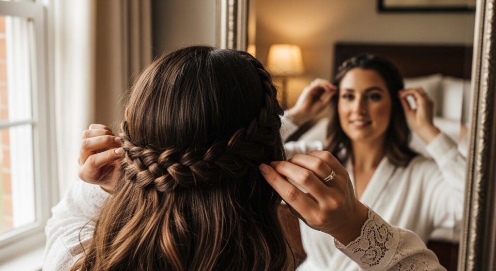 Drape the braid across your head like a headband. Play with the placement—it can sit right at your hairline or slightly back for a different feel.