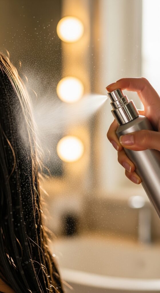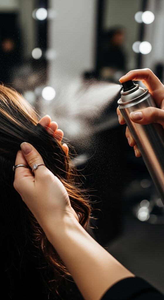 For hold, don’t just spray into a cloud. Be targeted. If I want my side part to stay, I lift the section at the part, spray the *underside* at the root, then place it back.