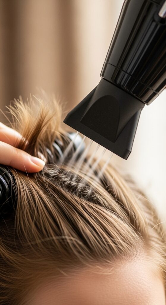 You don’t need to fully blow-dry your hair to perfection. The goal here is to get it about 80% dry, focusing on the roots. Dry roots are the secret to lasting volume and faster overall styling.
