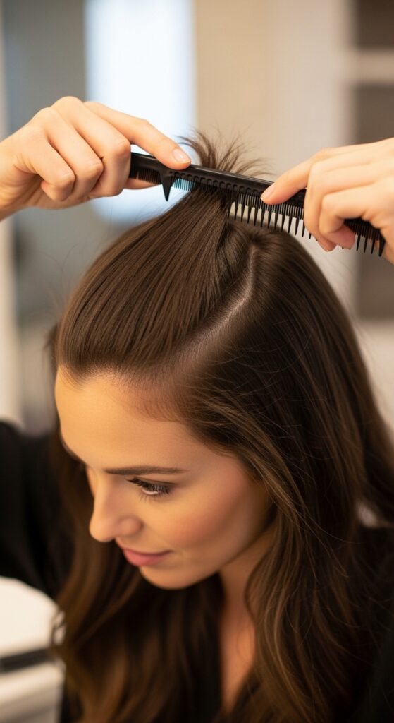 Need instant volume at the crown? Teasing is not outdated; it’s effective. But be strategic. I only tease the very top layer at my crown, in a section about two inches wide.