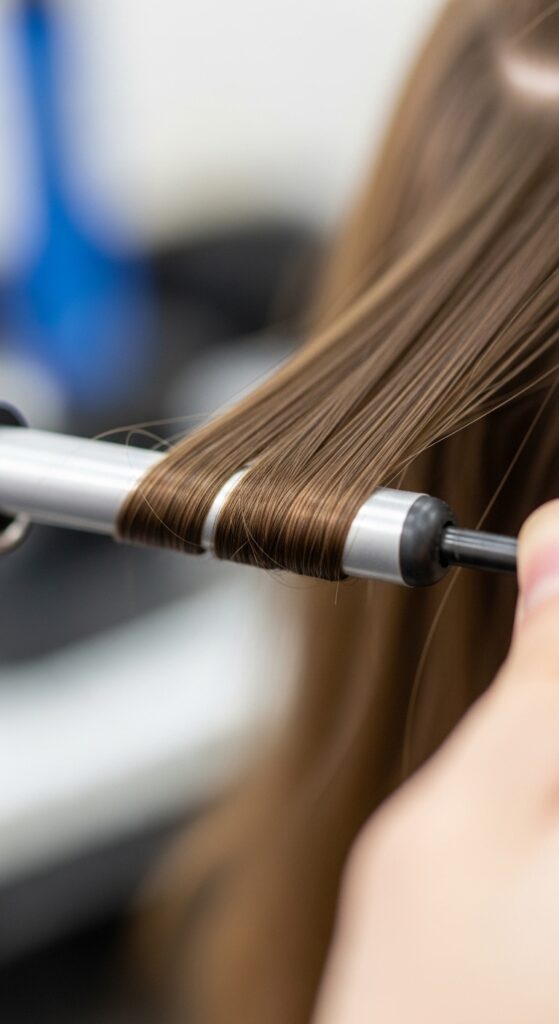 For a sleek look, this is your fastest tool. Take a small, thin section from your clipped-up area. Clamp the iron near the root and glide it down in one smooth motion.