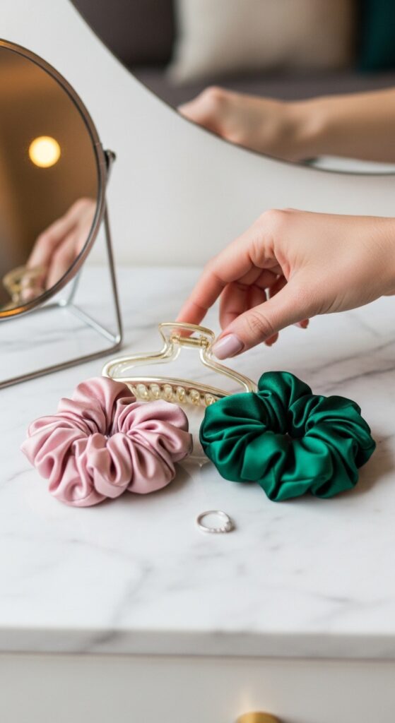 Have your go-to accessories in one easy spot. A claw clip, a silk scrunchie, a couple of elegant pins. If your style isn’t holding or you need a change by midday, you’re prepared.