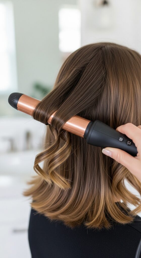 For loose waves, a large-barrel curling wand is faster than a traditional iron. I take a slightly larger section. I clamp the wand about halfway down the hair shaft, wrap the hair around it, and hold for 8-10 seconds.