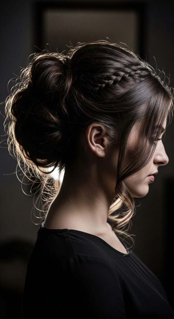 • Romantic Goth Hairstyles: Deep side part, slightly teased roots. Add a small, ragged braid or twist pinned with a safety-pin-looking accessory.