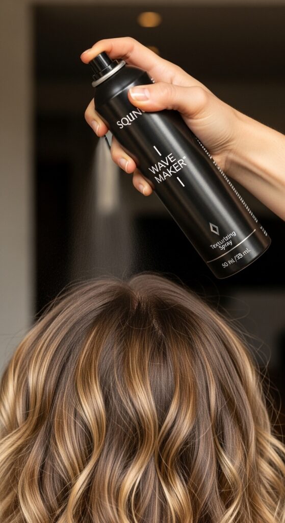3. All-Over Texture: Flip head over, spray mid-lengths to roots, scrunch, and flip back. Instant volume and style.